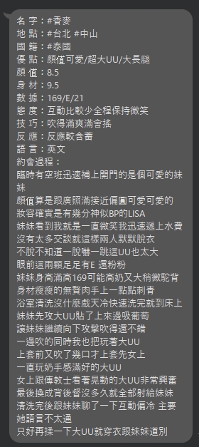 香麥-身高166/體重47/年紀20/罩杯E/泰國